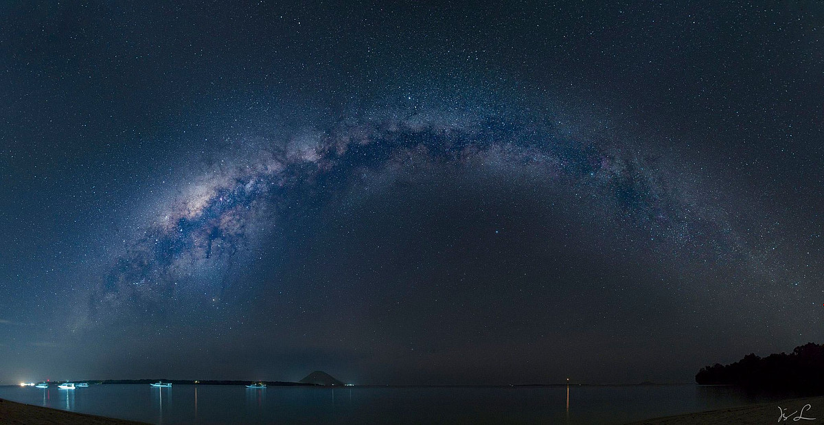 Milchstraßenpanorama Richtung Westen über dem inaktiven Vulkan Manado Tua im Bunaken Marine National Park (Nord-Sulawesi/Indonesien), aufgenommen von der Insel Siladen am frühen Morgen.