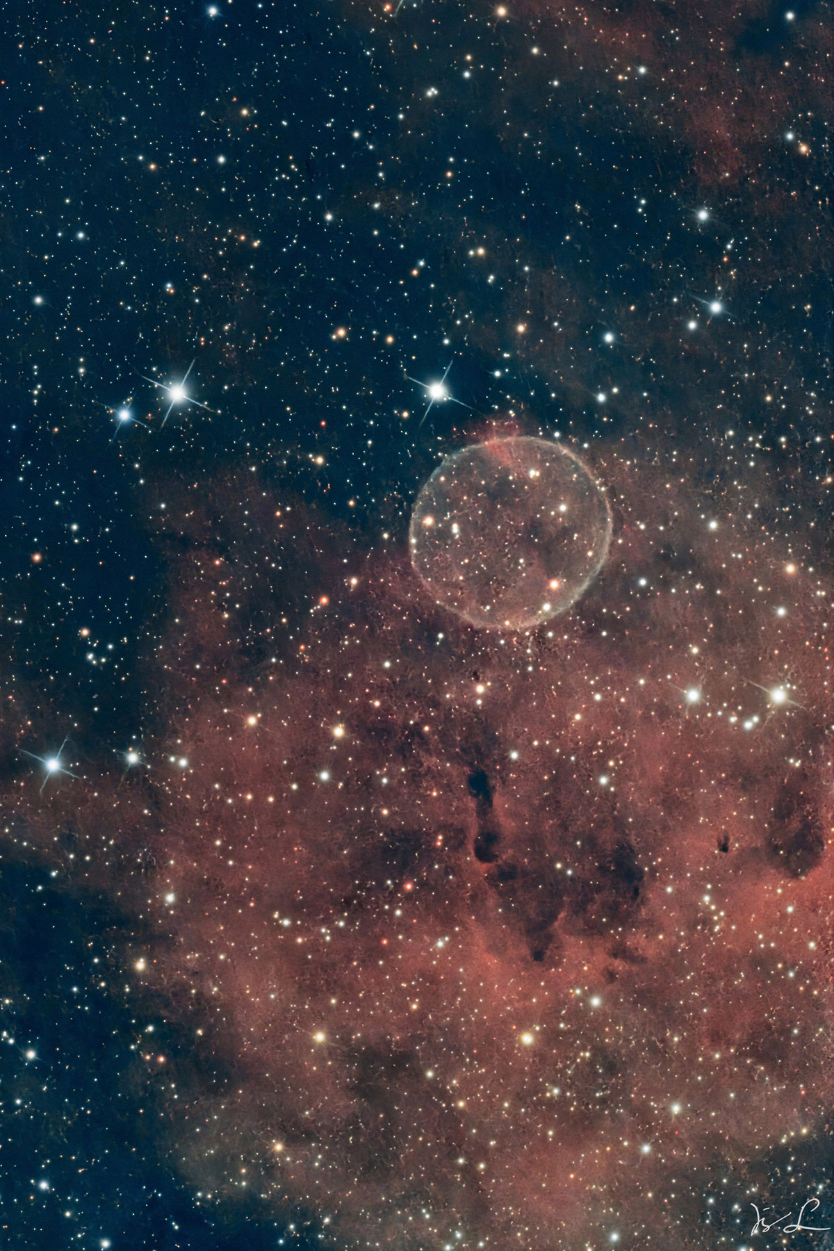Durch die intensive ultraviolette Strahlung des Wolf-Rayet-Sterns leuchtet das Material, wodurch der innere Bereich überwiegend rötlich im H‑Alpha erscheint. Detailaufnahmen zeigen zudem eine Hülle aus blau leuchtendem, ionisiertem Sauerstoff (O III), die den vernarbten Nebel umgibt.