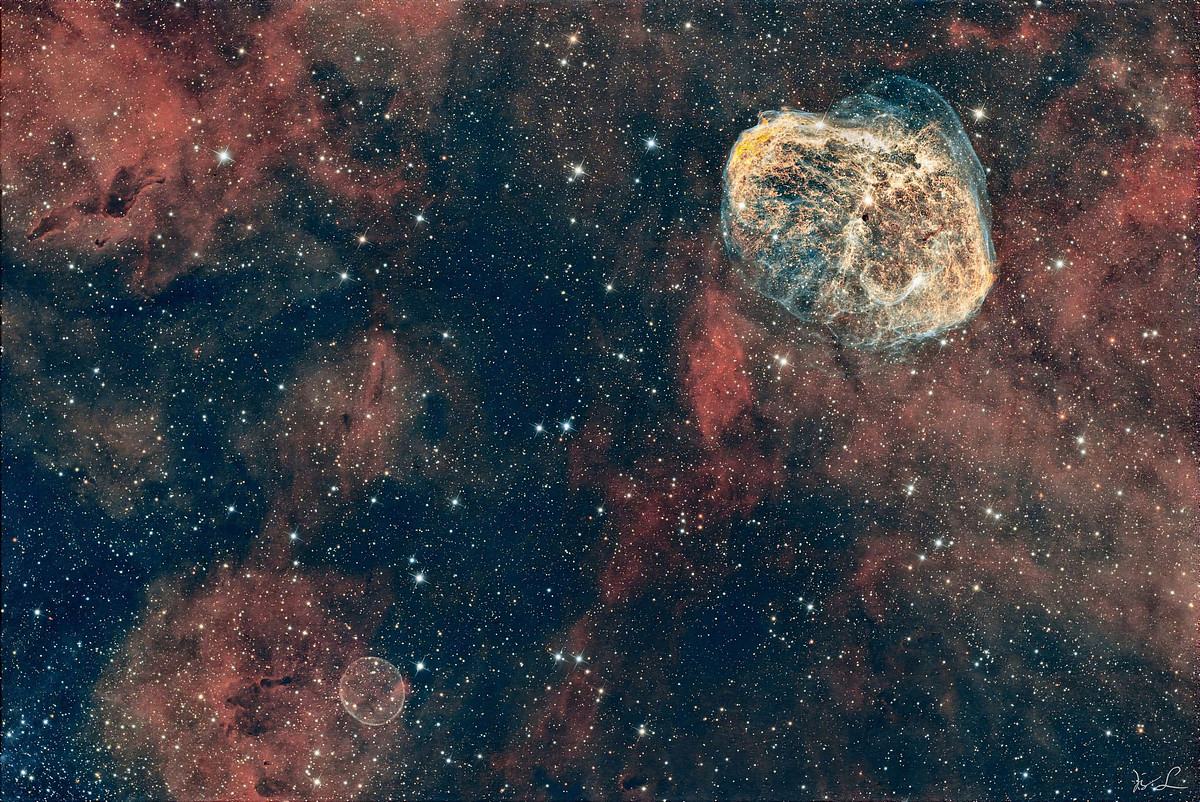 Die Aufnahme zeigt den Sichelnebel und den Seifenblasennebel gemeinsam in ihrem Himmelsumfeld. Die dazugefügten Detailaufnahmen geben einen genaueren Einblick in die Strukturen beider Nebel: die pockennarbige, filamentreiche Schale des Sichelnebels sowie die sphärische, seifenblasenartige Form des Seifenblasennebels werden so besonders sichtbar.
