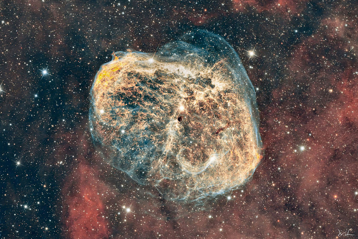 Der Sichelnebel (NGC 6888) ist ein klassischer Wolf-Rayet-Emissionsnebel im Sternbild Schwan, etwa 5.000 Lichtjahre von der Erde entfernt und rund 25 Lichtjahre groß. Im Zentrum des Nebels befindet sich der heiße Wolf-Rayet-Stern WR 136, dessen extreme Temperatur starke Sternwinde erzeugt. Diese Winde holen langsamere, zuvor ausgestoßene Materie ein und prallen auf sie, wodurch ältere Gaswolken komprimiert und aufgeheizt werden. Dabei entsteht eine pockennarbige, filamentreiche Schale aus dichterem Material, die wie eine Vernarbung wirkt und oft als „stellarer Schrottplatz“ beschrieben wird, an dem der Wolf-Rayet-Stern seine eigene frühere Materie verdichtet und neu formt.
