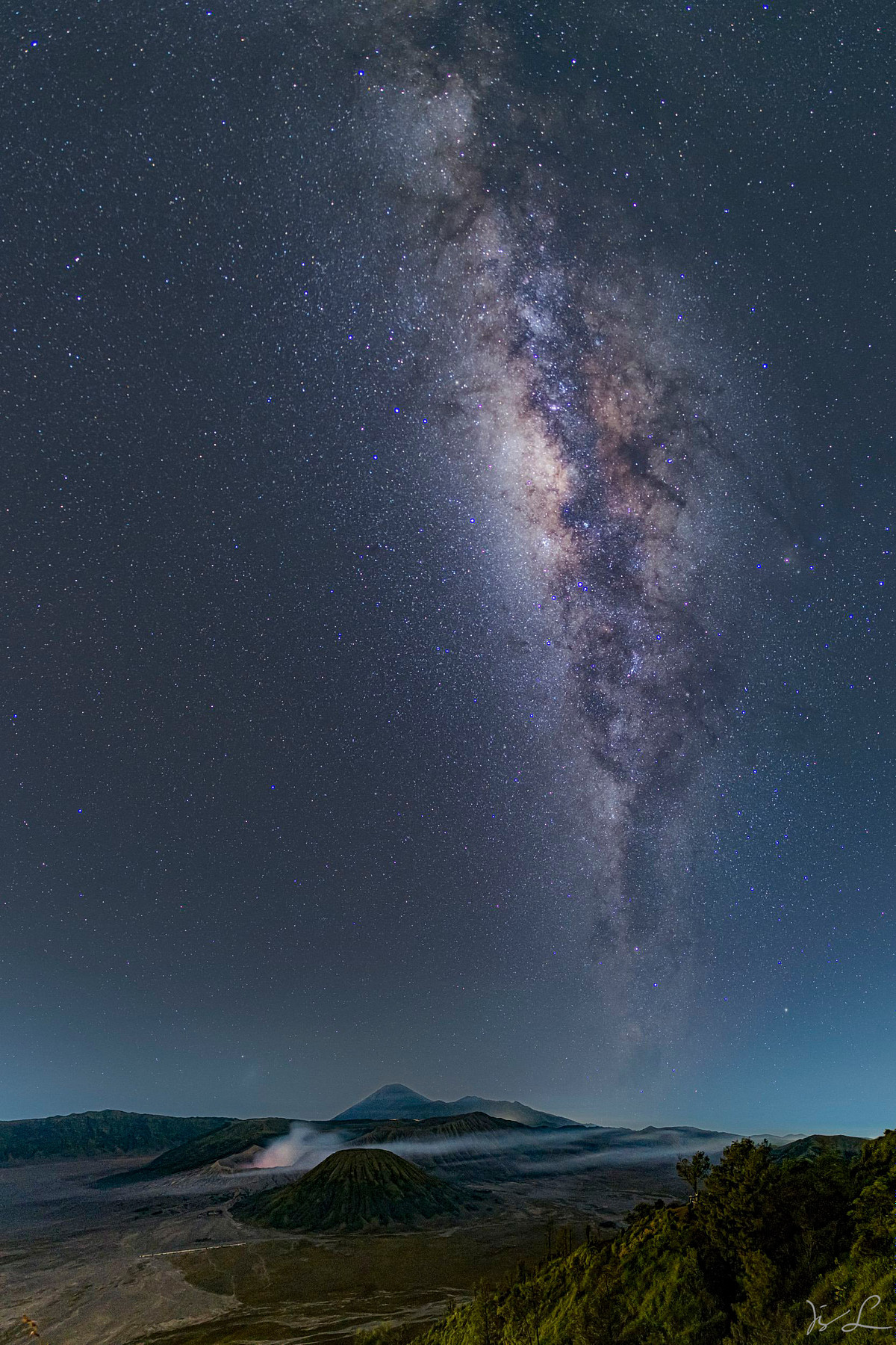 Um Mitternacht zieht Nebel in die Tengger-Caldera auf der indonesische Insel Java, während der Mount Bromo in der Mitte seine Aktivität nicht nur durch Rauchentwicklung, sondern auch durch das nur nachts sichtbare rötliche Leuchten zeigt. Über dem Vulkankomplex thront die majestätische Milchstraße.