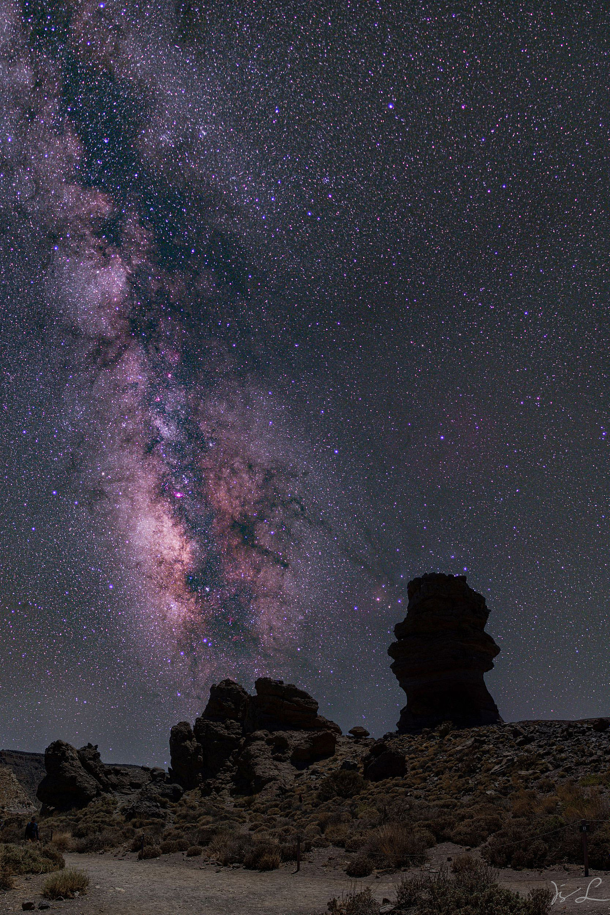 Die majestätische Milchstraße erhebt sich senkrecht über den markanten Felsformationen der Roques de García in der Teide-Caldera. Die Aufnahme des Sternenhimmels entstand mit einer astromodifizierten Kamera, die die feinen Strukturen des Milchstraßenzentrums besonders detailreich sichtbar macht, während der Vordergrund in einer separaten Aufnahme mit einer nicht modifizierten Kamera festgehalten wurde.