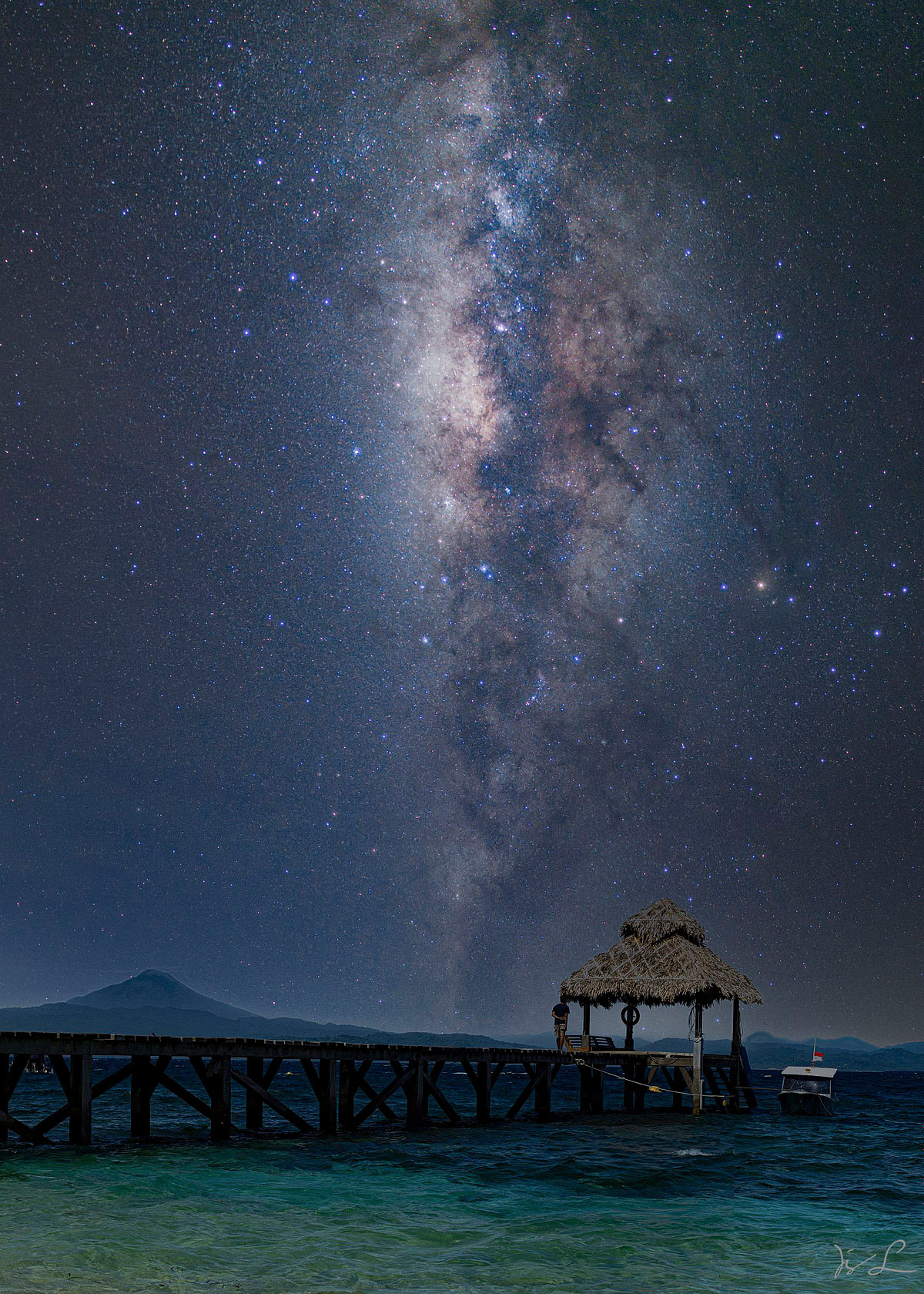 In einer Nacht im Juni steht die Milchstraße senkrecht über dem Jetty des Coral Eye Resorts auf der Insel Banka an der Nordspitze von Sulawesi.