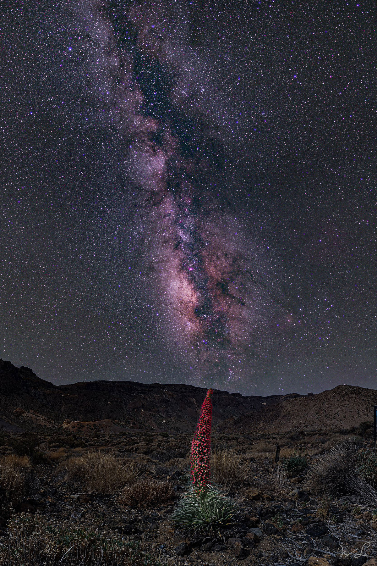 Die Milchstraße erhebt sich senkrecht über der Wand der Teide-Caldera, ihr leuchtendes Band durchzieht majestätisch die Nacht. Im Vordergrund setzt der rote Natternkopf einen lebendigen Akzent. Die Sterne wurden mit einer astromodifizierten Kamera eingefangen, der Vordergrund separat mit einer konventionellen Aufnahme festgehalten.