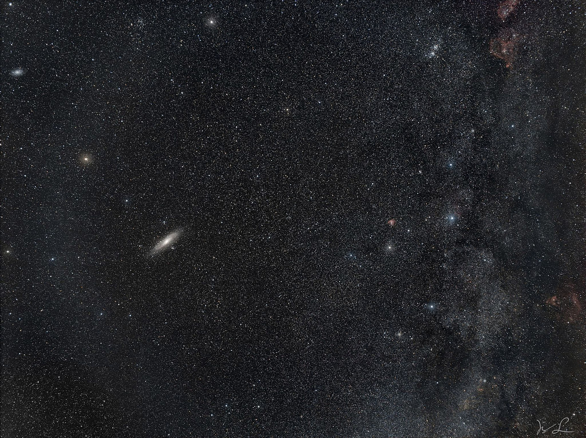 Die Aufnahme zeigt die untergehende Milchstraße am Himmel von Siladen in Indonesien am frühen Morgen im Oktober. In der Mitte ist der Andromedanebel zu sehen, in der linken oberen Ecke die Dreiecksgalaxie M 33. In der Milchstraße, die den gesamten rechten Bereich des Bildes einnimmt, ist das W des Sternbildes Cassiopeia deutlich zu erkennen mit dem vorgelagerten Pacman-Nebel. Am oberen rechten Rand befinden sich der Herz- und der Seelennebel.