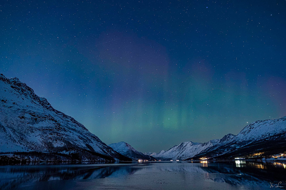 At Ullsfjord, the aurora is just starting to appear in the early evening, its faint glow unfolding across the Arctic sky