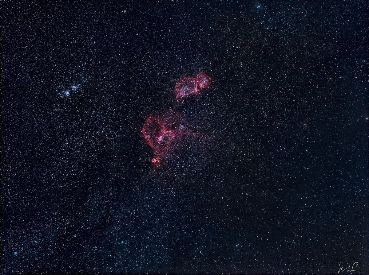 The Heart Nebula (IC 1805) is an emission nebula in the constellation Cassiopeia, containing an open star cluster at its center. It is located about 7,500 light-years from Earth in the Perseus Arm of the Milky Way and has a diameter of approximately 200 light-years. The characteristic reddish regions of the nebula are illuminated by the stars of the cluster, and its heart-shaped structure gives it its name.
