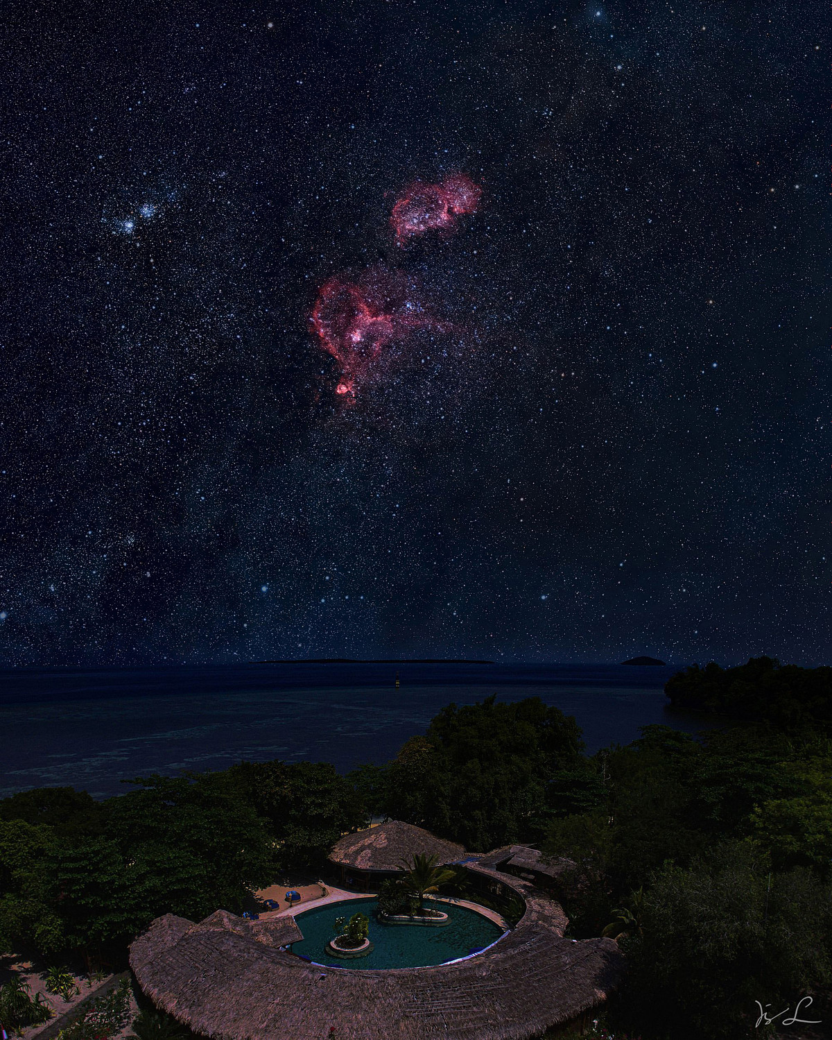 From a northwest drone perspective, the Siladen Resort with its pool area, restaurant, and surrounding buildings fills the foreground. Beyond, the islands of Mantehage and Nain of Bunaken National Park emerge in the distance. Above them, the emission nebulae IC 1805 (Heart Nebula) and IC 1848 (Soul Nebula) sink toward the horizon. Their position directly above the resort links the astronomical scene to the symbolic idea of the Siladen Resort as the heart and soul of the island.