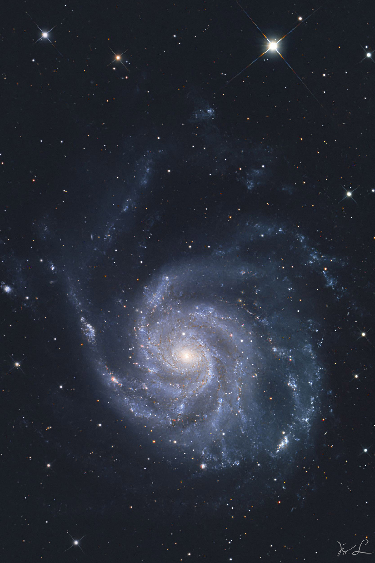 Characteristic features of M101 are its open, loosely wound spiral arms, which are threaded with numerous bright star-forming regions, young star clusters, and glowing gas nebulae. The galaxy appears slightly asymmetrical: one side looks more pronounced and structured than the other. This uneven shape is likely the result of gravitational interactions with smaller companion galaxies.
